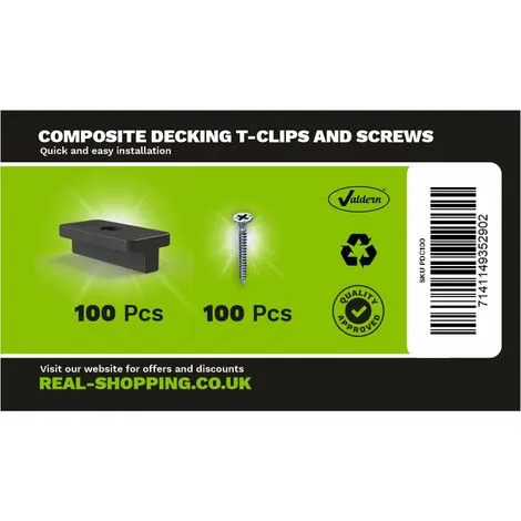 - T clips to fit in composite decking groves and high quality wood screws. (M4 x 35mm)