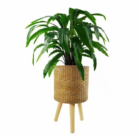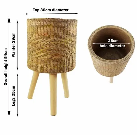 This planter is made from fibreglass composite but is an extremely convincing replica of a woven basket planter. The advantage of this is that it is waterproof, watertight and will not go mouldy when exposed to water for long periods of time like real seagrass or woven baskets making this suitable for humid locations like bathrooms but also for watering real plants. Measures 54cm x 30cm Rattan Effect fibreglass composite Planter. Large fibreglass composite planters, hand finished in a rustic style. Available in a range of designs and sizes. Large planter ideal for either artificial plants or real ones. Designed for indoor use but can be used outdoors in a sheltered position, we recommend protecting from extremes of weather. n nOverall size: 30 x 30 x 54cm. At the widest point this pot measures 30cm. The top rim has a diameter of 30cm. The inner hole diameter is 25cm, any of our plants with starter pots smaller than this and all our bare stem plants will fit perfectly inside this planter. Legs measure 25cm. Top planter measures29cm x 30cm. Please see images for a size diagram. n nNo drainage holes so suitable for watering indoor plants. Intentional Rustic finish. Comes requiring minor assembly by screwing on legs – the legs are double threaded so by twisting the bolt the opposite direction you can extend or reduce the length of the screw part that fits into the planter. n nMaterial: Fibreglass composite. Legs: Wood