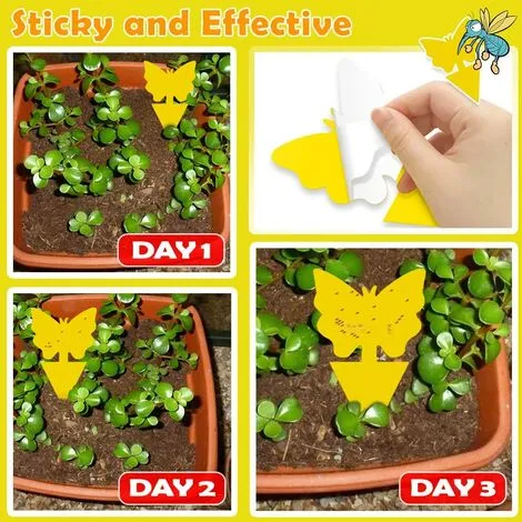 Comfortable Appearance & Easy to setup: Butterfly shape design, dealing with the pest problem in a decorative way. The fruit fly trap with sharp bottom can be inserted directly into the soil, avoiding the trouble of tying ropes or hooks. Remove the protective cover paper from the sticky traps. Kindly Note: If touch the glue accidentally, rub gentally with vegetable oil and wash with soap or hand cleaner.