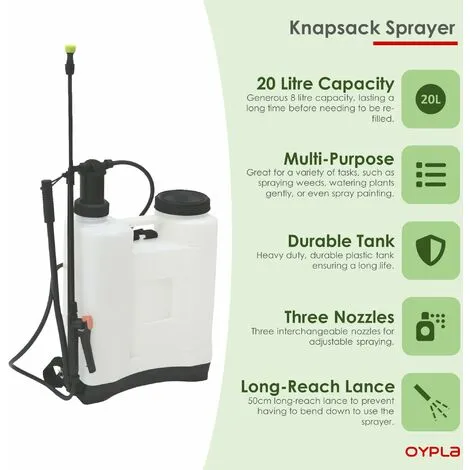 The knapsack sprayer has a capacity of 20L of liquid and is perfect to perform a versatile range of tasks from killing weeds to spraying fences. The sprayer is able to safely hold pesticides, insecticides, fertilisers and any horticultural or agricultural chemicals. The sprayer incudes 3 inter-changable nozzle tips that vary flow and spray pattern to ensure that it is suitable for any task needed. The tank includes a filter on the filling hole to help prevent blockages. The sprayer includes shoulder straps and also a long-reach 50cm lance to get those hard to reach places, and also has a locking trigger for continuous spraying.