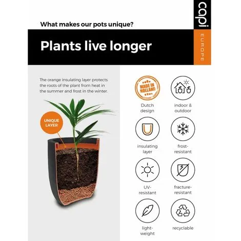 The low flower pot is perfect to combine with other available shapes and sizes within the Capi Arc Granite collection! The featured planters surely add a natural appearance to any indoor and outdoor space. Furthermore, all planters are shatter-proof and 100% recyclable. Despite the robust exterior, the plant bowls are lightweight. Due to their smooth material the planters are easy to clean, which makes them perfect for outdoor use in all weather conditions.