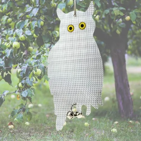 - Reflective owl with jingle bells, to scare away birds. Keep your home, garden, car, etc., free of birds.