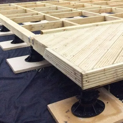 The bearings are made of recyclable polypropylene. Large load capacity of 2700 kg/m². The material does not break or deform, the terraces remain in the long term without wobbling or tilting.