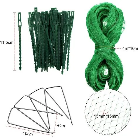 Size detail: the net measures approx. 4 x 10 m/ 13.1 x 32.8 ft, and the mesh size is 15 x 15 mm, suitable size for rain and sunshine to pass through normally, the cable tie measures approx. 11.5 cm/ 4.5 inches, the stakes measure approx. 100mm in length, 2.5mm in diameter and 40mm in width