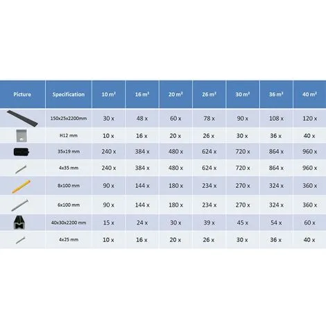 Delivery includes 30 decking boards, 10 first & last board stainless steel clips, 240 plastic spacer clips, 240 stainless steel screws (4 x 35 mm), 10 screws (4 x 25 mm), 90 plastic tubes for expansion screws, 90 stainless steel expansion screws, and 15 joists.